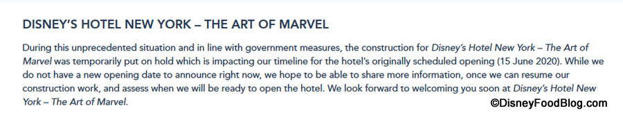 Due to the current global health situation, construction was put on hold for the renovation of the hotel (as Disneyland Paris currently remains closed until further notice). Though the originally announced opening date was June 15, 2020, the website now states that the timeline for the opening has been impacted.