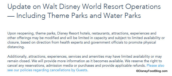 The language states: “Upon reopening, theme parks, Disney Resort hotels, restaurants, attractions, experiences, and other offerings may be modified and will be limited in capacity and subject to limited availability or closure, based on direction from health experts and government officials to promote physical distancing.”