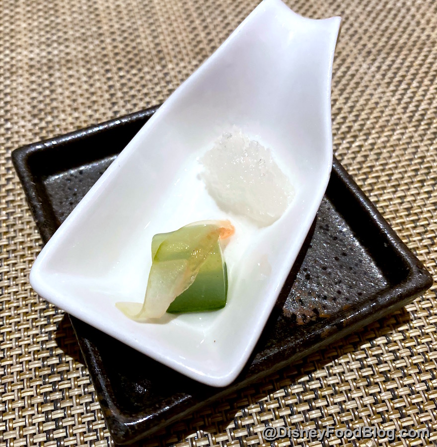 The next course came right when we needed it (almost as if they had planned it that way! 😉 ) and served a similar purpose to the first course. The Hashiyasume is a palate cleanser of Cucumber and Ginger and was designed to be eaten in one bite.