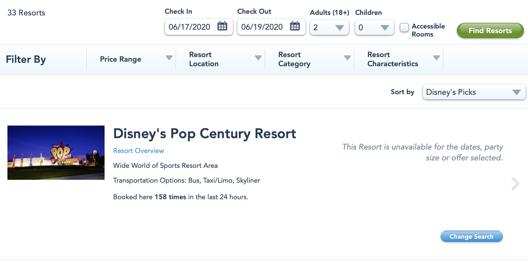 When checking the website, we found that we were unable to book any new Disney World Resort hotel reservations through the month of June.