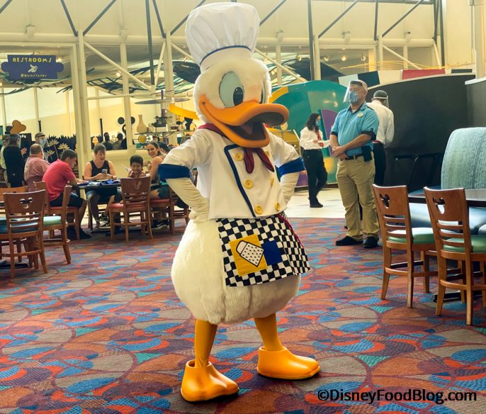 This perk is truly invaluable, and you will probably get way more time with the characters here than you will in most other character meet-and-greet scenarios. Note that the characters are staying a little bit distanced at this restaurant (like with all character dining right now), so they won’t be coming right up to the front of your table. They stay on the inside loop of this restaurant, while guests eat at the booths on the outside loop.