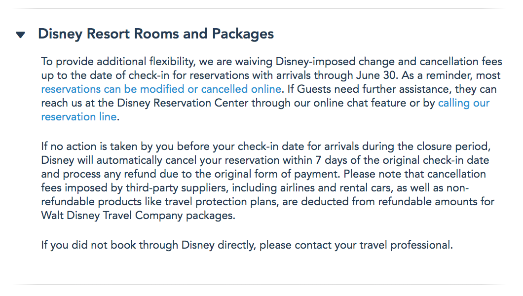 Does this mean that since I didn’t rebook my Memorial Day weekend trip, I’m no longer eligible? I was waiting because even if the parks didn’t open, but the resorts did, I still would’ve gone. I decided last week to go ahead and reschedule to late June but that was the same day they stopped accepting new offers for June. My reservation hasn’t been cancelled yet. So bummed!