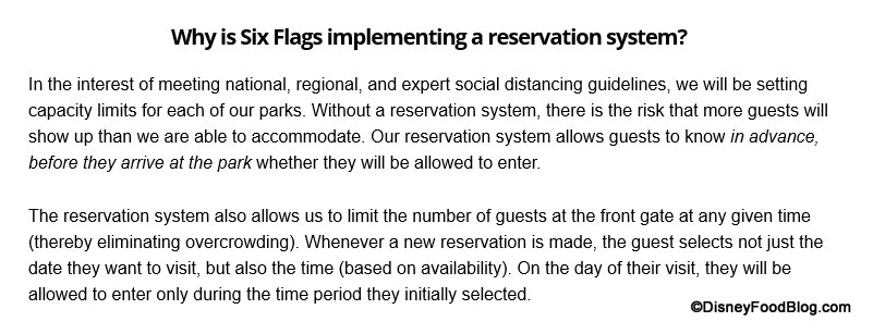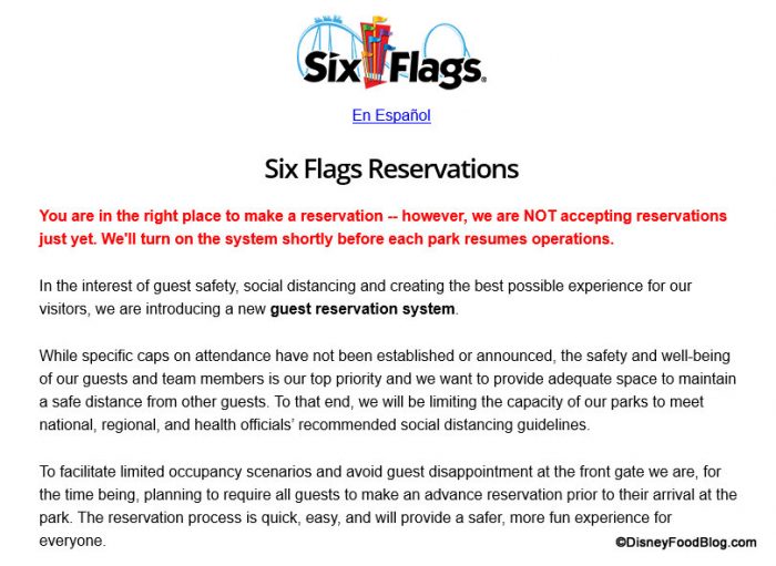 As seen in the screenshot above, Six Flags shares: “To facilitate limited occupancy scenarios and avoid guest disappointment at the front gate we are, for the time being, planning to require all guests to make an advance reservation prior to their arrival at the park. The reservation process is quick, easy, and will provide a safer, more fun experience for everyone.”
