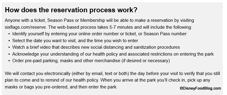 Six Flags has also provided a list of FAQs including topics such as cancellation of reservations (noting no penalties for canceling any time before 8:00 AM local time on their scheduled day), required pre-payment for parking, and more, including a section detailing how the process will work.