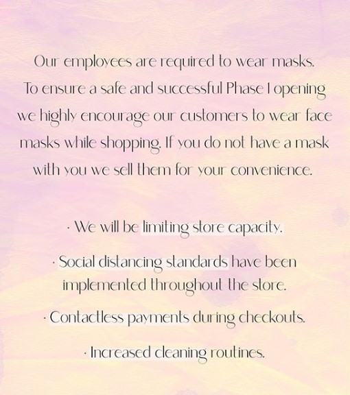 American Threads is requiring their employees to wear masks, encouraging customers to wear masks, and selling masks. They are also limiting store capacity, implementing distancing standards, giving the option for contactless payment, and increasing cleaning routines. We’ll keep you updated with all the other stores set to open next week!