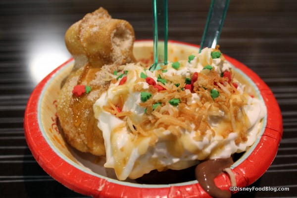 For $11, you will be literally (not literally) plunged into a vat of peanut butter, hot fudge, 3 scoops of ice cream, and whipped cream. Beaches and Cream just reopened not too long ago after a lengthy refurb and there is finally more seating, but we still highly recommend snagging an advance dining reservation before you go! And don’t be afraid to pair their sweet snacks with more savory menu items like their awesome Chili and Cheese Tots for $9!