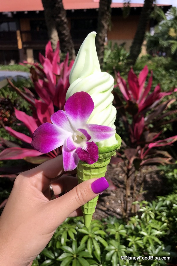 This spot changes up their Dole Whip offerings frequently, but we’re big fans of this Moana-inspired Lime soft-serve cone! It’s similar to the Peter Pan Float at Storybook Treats in Magic Kingdom, but comes garnished with a beautiful edible orchid instead!