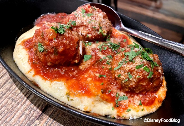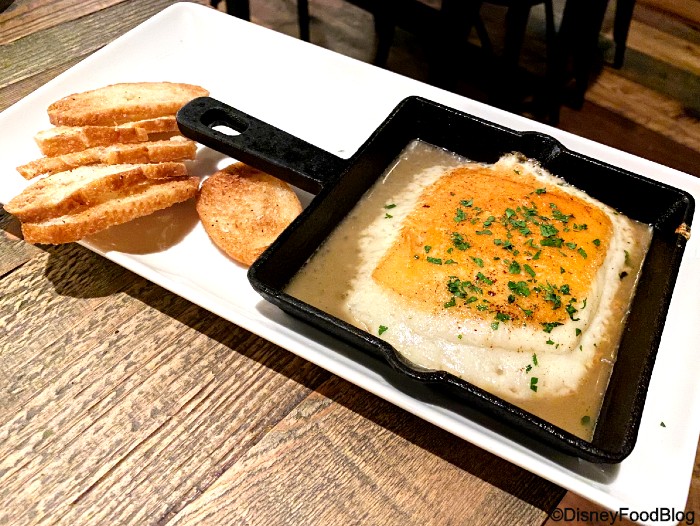 Wine Bar George is a Disney Springs restaurant led by Master Sommelier George Miliotes, and it’s a favorite dining spot for both tourists and locals alike. Among all the standout menu items, including small plates and charcuterie items, is the favorite Saganaki on Fire for $16, made with Vlahoriti cheese (a Greek sheep milk cheese on the firm side), then doused in Metaxa liquor and lit on fire tableside. You get Crostini to scoop up all the delicious cheese, and make sure you ask for more! And yes, it’s absolutely delicious. It is fried cheese, after all.