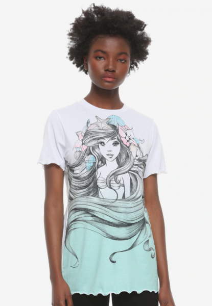 As cozy as that sweatshirt is, we all know the weather is getting warmer and warmer each day! With sunny days and blue skies ahead, how about a fun Ariel t-shirt to wear this summer? You can totally bring all the fun vibes from ‘under the sea’ to land with this super chic sketch design.
