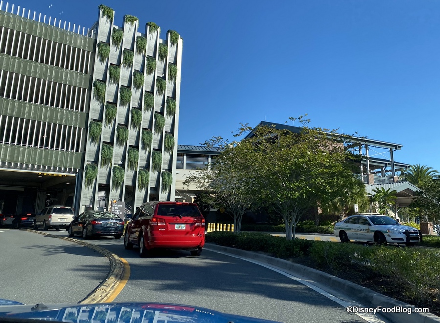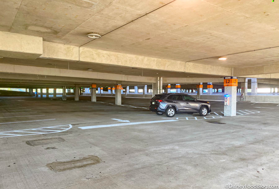 All of the surface-level lots are currently closed so guests may self-park (no valet available at this time!) in the Orange and Lime garages. We were told that the Orange garage would be filled first, and we were able to choose our parking spot since there were no Cast Members directing traffic within the garage.