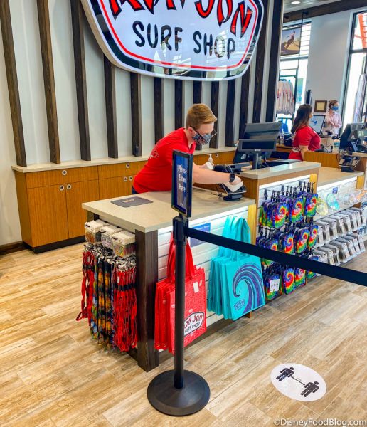 Plus, we also spotted social distancing markers and signs in front of cash registers like at Ron Jon Surf Shop.