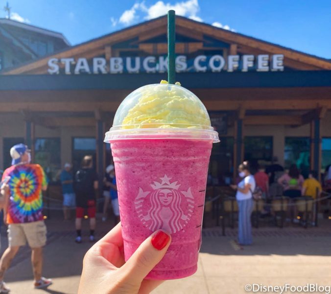 On our visit to Joffrey’s Coffee and Tea, we learned that guests are allowed to walk around with their food or drinks in Disney Springs. And while guests are required to wear their masks at all times, they are allowed to lower masks to take a bite or drink — then recover their faces. We put this method to the test with the brand new Welcome Drink from Starbucks!