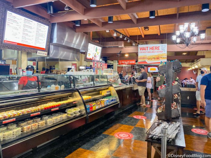 Like Blaze Pizza, Earl of Sandwich is an assembly line style spot. The difference is that Earl of Sandwich has cases that help to keep guests distanced from the glass. Of course, there were distancing stickers too.