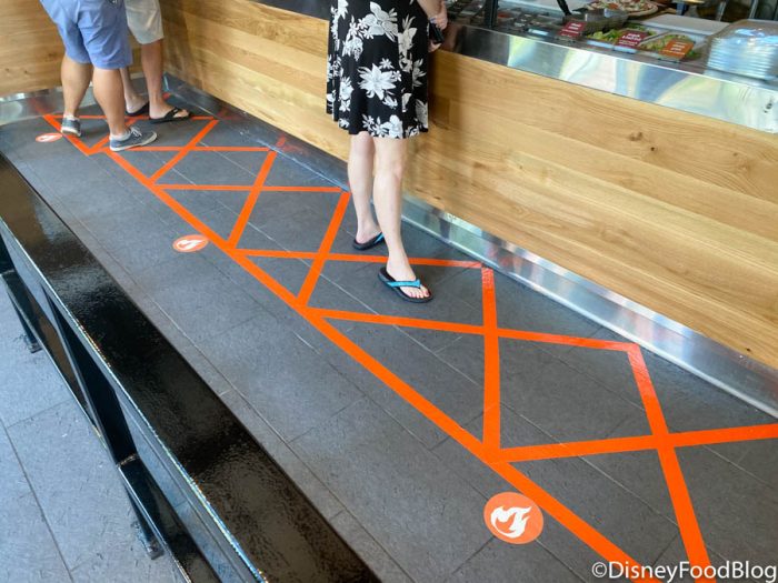 Finally, we took a trip over to Sunshine Churros to see what kind of changes this kiosk had. Like everywhere else, we saw ground stickers to keep guests’ distances.