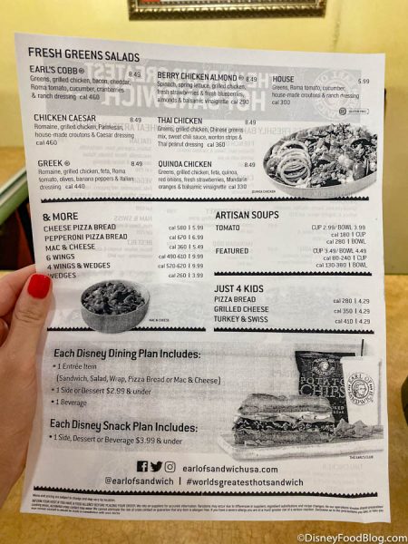 Their menu looked largely the same with many of our favorites available for purchase! Their disposable menus also provided information about what your Disney Dining Plan credits would get you.