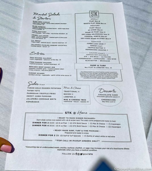 At the bottom of the disposable paper menu, we noticed STK was selling dinner packages to-go! Most of the meals included a 6 oz. steak, sauce, and two sides.