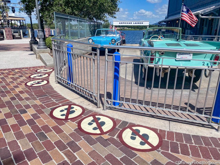 The Amphicar Launch was scheduled to open today, but when we stopped by, there were not any guests using them. There were markers on the ground for guests to observe the cars — er, boats — er, amphicars.