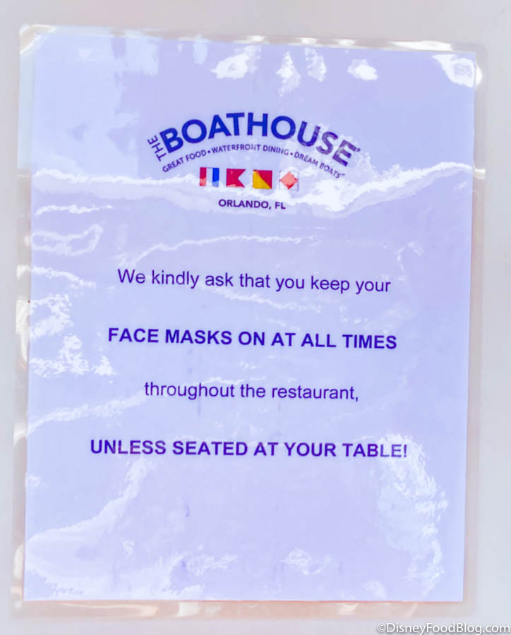 After our visit to The Boathouse, we thought that the new health and safety measures were well thought out and executed by the staff. Everyone we interacted with seemed happy to be back and were kind and attentive to guests. Although we felt like the servers were being careful and safe, we noticed The Boathouse’s approach was much less overt as Margaritaville in CityWalk. Margaritaville thoughtfully explained what was going on and how they were handing each item for our safety. The Boathouse was careful with distancing and sanitizing, but it felt like they were looking to maintain a similar guest experience to a pre-closure meal whenever possible.