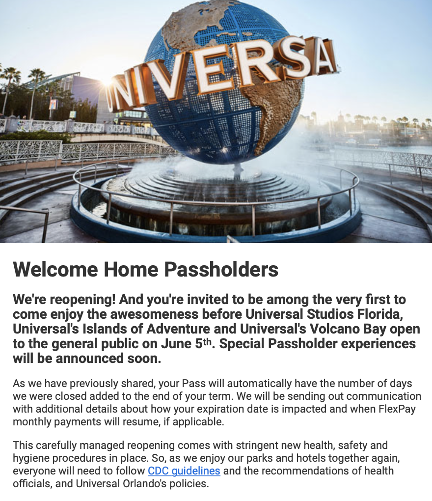 Universal Orlando Annual and Seasonal Passholders received an email today announcing the reopening with a “Welcome Home.” Special Passholder experiences will apparently be announced soon.