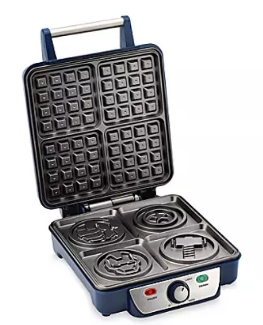 The maker (which is $39.99) serves up batches of four square waffles with imprints of Hulk’s fist, Iron Man’s helmet, Captain America’s shield, and Thor’s hammer.