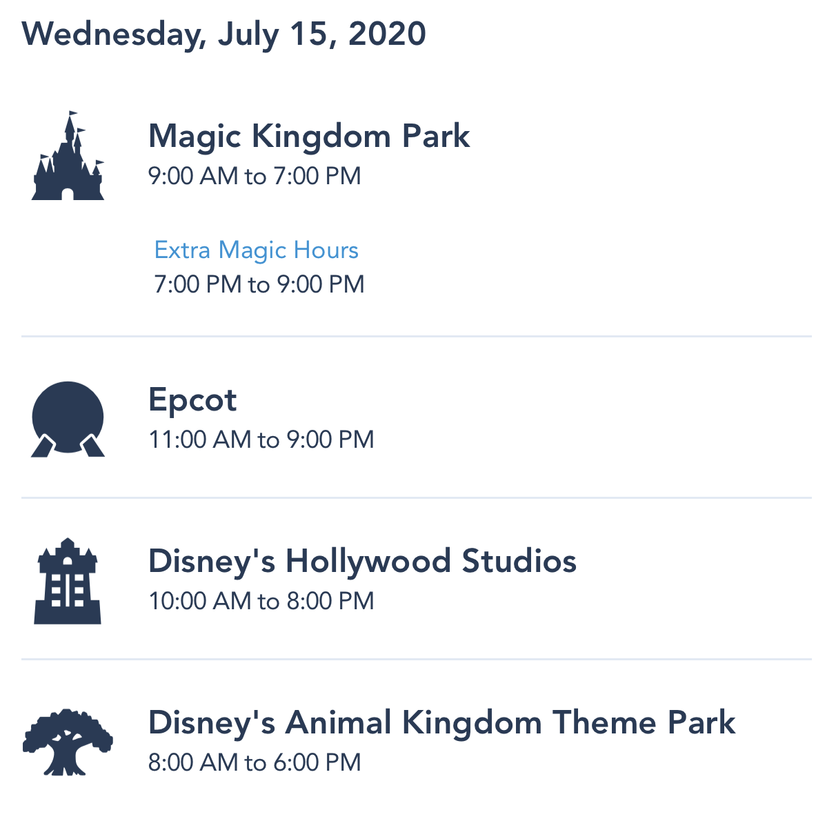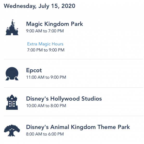 And, while the hours are subject to change, on July 11th, the reopening day hours listed for Magic Kingdom are 9 AM to 7 PM, and the hours for Animal Kingdom are 8 AM to 6 PM.
