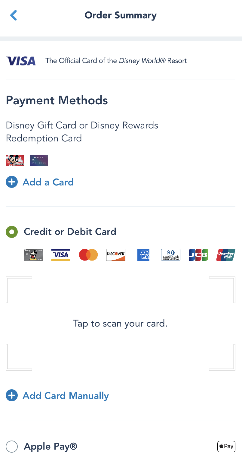 Guests now also have the option to pay with Apple Pay, Disney Gift Card, or a Disney Reward Card! For guests with Apple Pay set up on their mobile device, they will see the option to use Apple Pay on their order summary page.