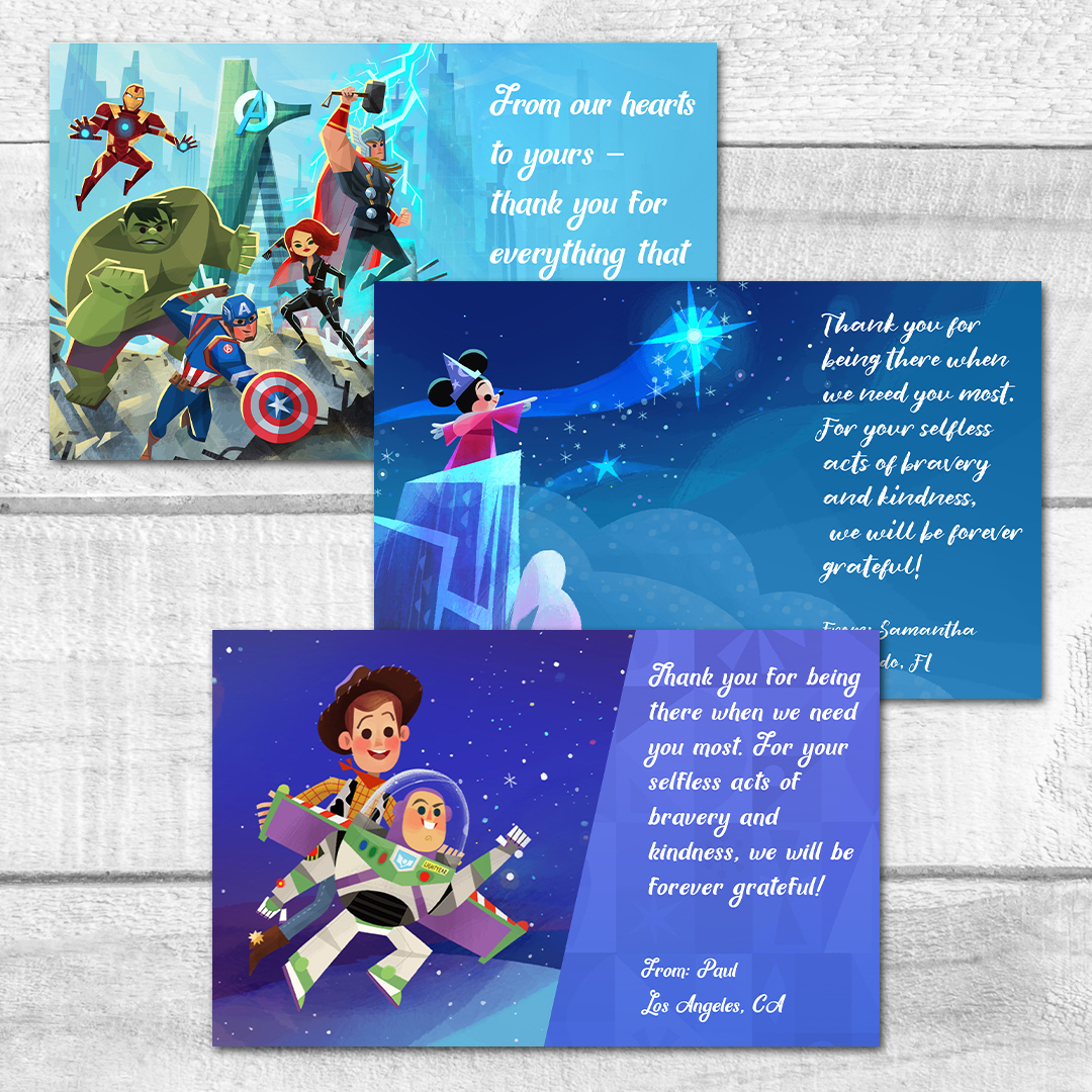Cast Members created more than 17,500 customized cards that Disney then printed and mailed to healthcare workers at almost 40 hospitals around the country. This Disney Magic Moments effort was to thank workers personally for their support, courage, and sacrifices.