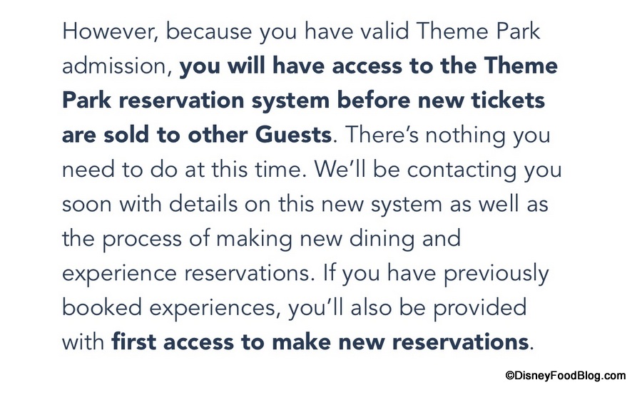 The message goes on to say that “because you have valid Theme Park admission, you will have access to the Theme Park reservation system before new tickets are sold to other Guests.” (Note that — depending on your currently booked experiences — the phrasing in your message may vary slightly, if you are a recipient.)