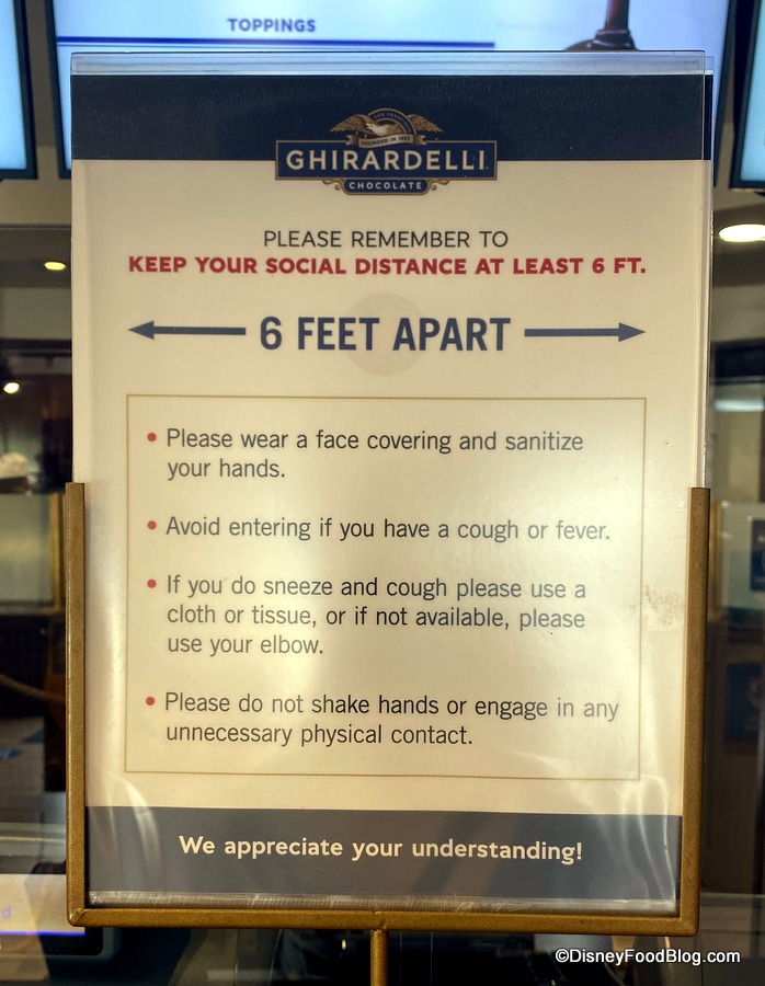 Additional signage provides more reminders of the new safety measures for shopping and dining in Disney Springs, which also include the required wearing of face masks, more distancing notices, and more.