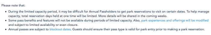 Information on this page shares that due to high-demand for re-entry (and the parks not being able to accommodate as many guests each day) Annual Passholders will only be allowed to hold a certain number of reserved days at one time once the new reservation system is put in place. They also share that it may be difficult for Annual Passholder’s to get reservations on certain dates. Here’s how the statement reads on Disney World’s website: