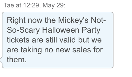Well, we had to get to the bottom of this pressing matter and, after speaking with a Cast Member today, we were able to confirm all Mickey’s Not-So-Scary Halloween Party tickets ARE still valid…but they aren’t selling any more of them right now.
