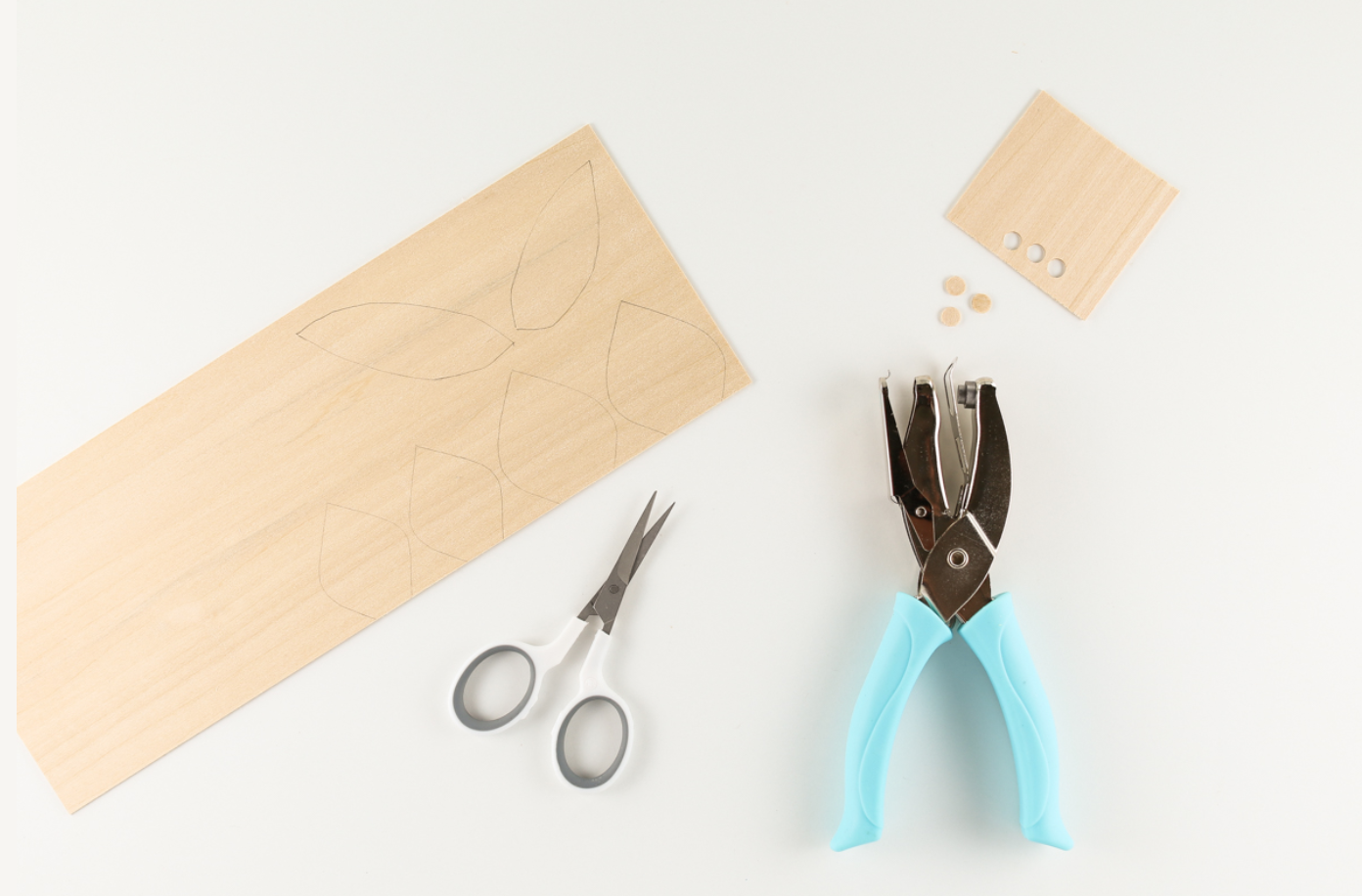Small dots can be punched out from the wood sheet using a hole punch. Paint any basswood cutouts with a base coat of the acrylic paint. Allow to dry completely. If more details are needed, use fine-tipped paintbrushes to add details atop the base coat of paint.