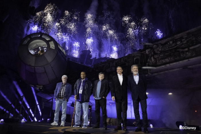 One of the most memorable events surrounding the opening of Galaxy’s Edge was the dedication ceremony that took place on May 30. Star Wars icons George Lucas, Harrison Ford, Mark Hamill, and Billy Dee Williams joined former CEO Bob Iger for the ceremony.