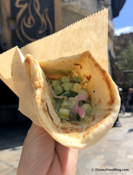 Over the past several months, we’ve seen a ton of exciting new FOOD options come to Galaxy’s Edge! Our beloved Ronto Wrap over at Ronto Roasters saw a couple of sister wraps appear on the menu, including a Chicken Ronto Wrap in Florida and a Ronto-less Wrap in California!