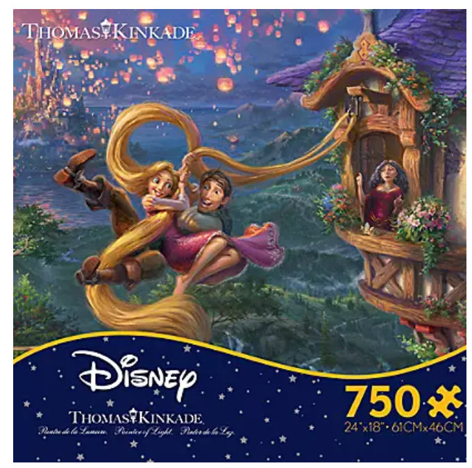The 750-piece Tangled Puzzle by Thomas Kinkade features Rapuzel (AND her hair) with Flynn Rider in front of the glowing lanterns with Mother Gothel looking on in the background.