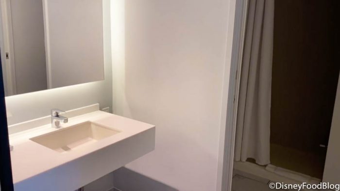 As for the bathroom, there was a separate sink area with a mirror while the toilet and stand-up shower were partitioned off by another doorway so someone could get ready if the other area was in use.