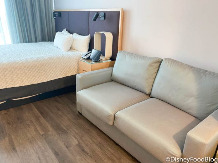 We got a king-size bed with a sleeper sofa for extra-lounging! The furnishings were sleek, modern, and more neutral-colored like the rest of the hotel.