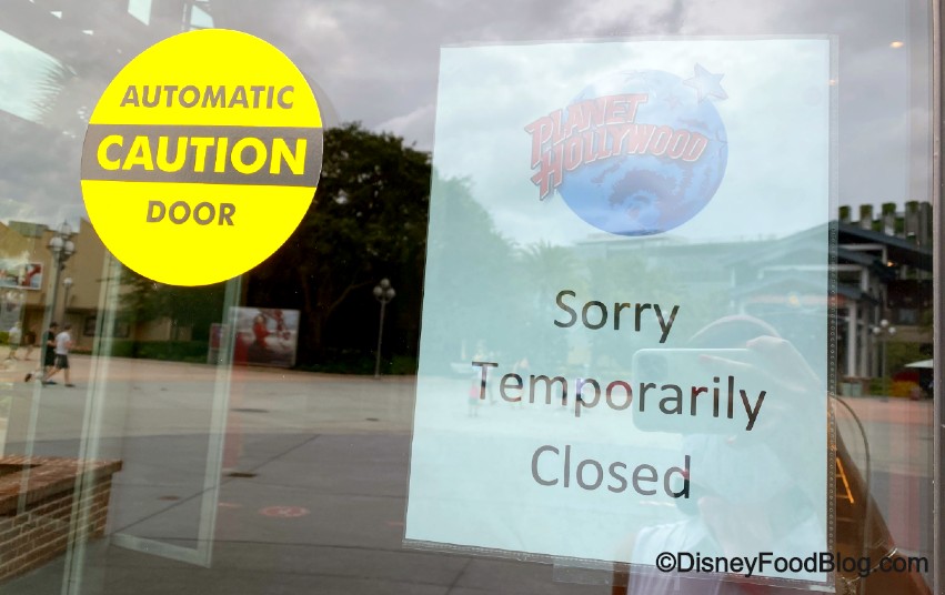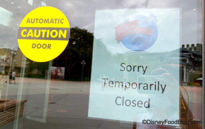 While strolling around Disney Springs today, we noticed that Planet Hollywood had a sign on its doors reading “Sorry Temporarily Closed.”
