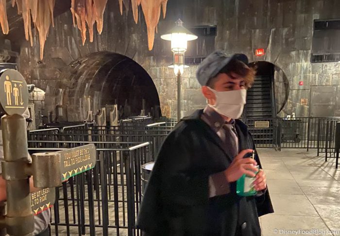 Escape from Gringotts typically has you grabbing 3-D goggles from bins. Today, the bins were empty and a team member was designated to individually hand out the goggles. Tip! It was much more comfortable to wear our goggles over our masks to keep them from fogging.