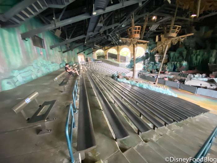 The actual line queue does feature markings for distancing guests. Preshows were not available on this attraction either.
