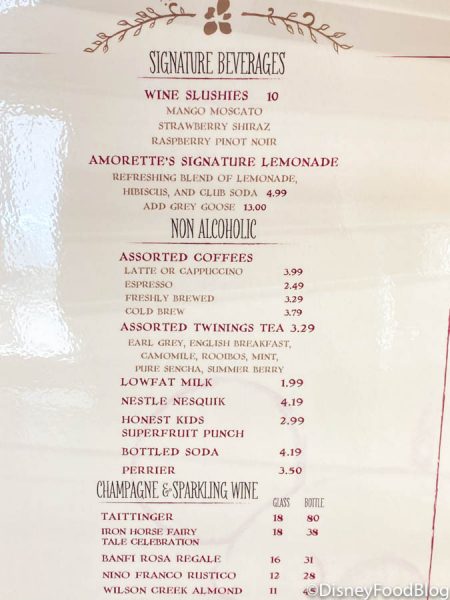 While Taittinger by the bottle still costs $80 (this place is fancy FANCY!) the champagne served by the glass is now $18 instead of $17. Amorette’s other bubbly, Iron Horse Fairy Tale Celebration, is still $38 by the bottle but has gone up to $18 from $15 by the glass.