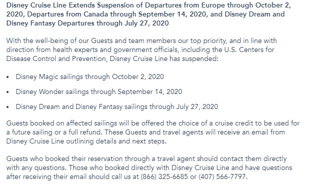 The Disney Cruise Line website references the cancellation of all Disney Magic departures through October 2nd. The Disney Magic makes up all European departures, effectively suspending European cruises through the fall.