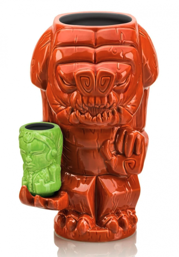 We found another pair of large & tiny tiki mugs to add to your collection of curiosities! This set features a 40 OZ rancor with his little 2 oz Oola mini muglet friend. But here’s the thing that has us puzzled — is the mini muglet for the rancor to drink out of? Look at how he’s holding her! What happened to poor Oola that she’s now being used by a rancor? Someone help her!