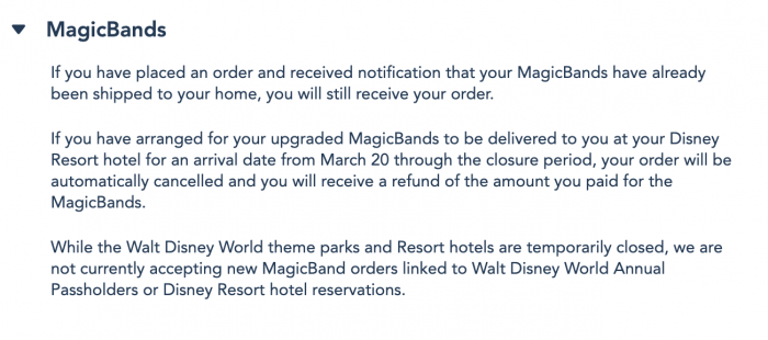 Shortly after the parks announced they were closing, Disney World suspended MagicBand orders. Guests who had placed orders that were shipped out would still receive their MagicBands while any upgraded MagicBands that were to be delivered to Disney World resort hotels after March 20th were automatically canceled and refunded.