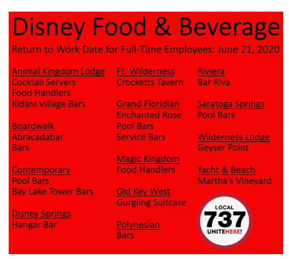 The Orlando Hotel and Restaurant Workers Movement which is affiliated with the Unite Here Local 737 union has also begun calling back Cast Members for several Disney World hotels. The post went on to state additional workers may also be called to some of the locations that have previously been announced and that they’ll be providing more information soon.