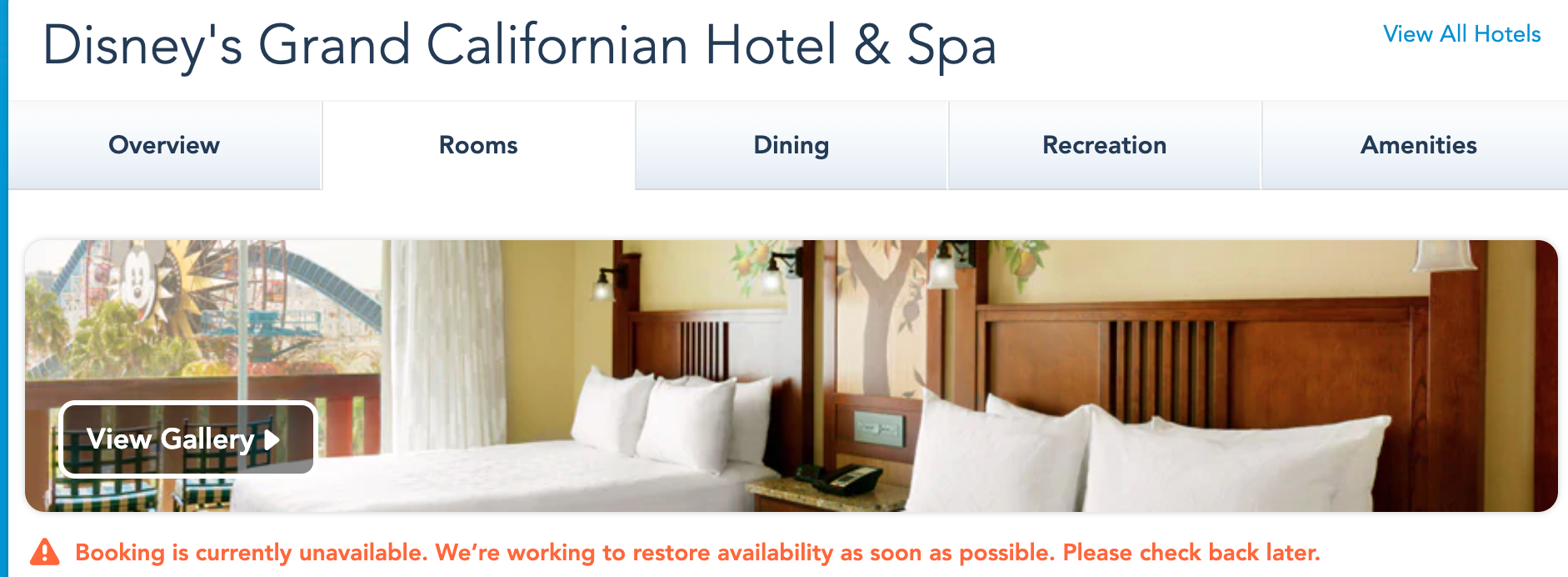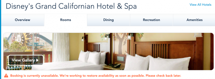 We noticed an error message on the page for Disney’s Grand Californian Hotel and Spa that indicates booking is currently unavailable. Even if we attempted to search for availability several months in the future, we were cycled back to this same page.