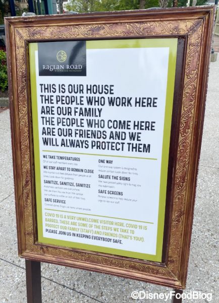 Like other spots around Disney Springs, Raglan Road had a sign out front outlining its health and safety measures, including keeping 6 feet away from others, increased sanitization, and safe screens in front of staff.