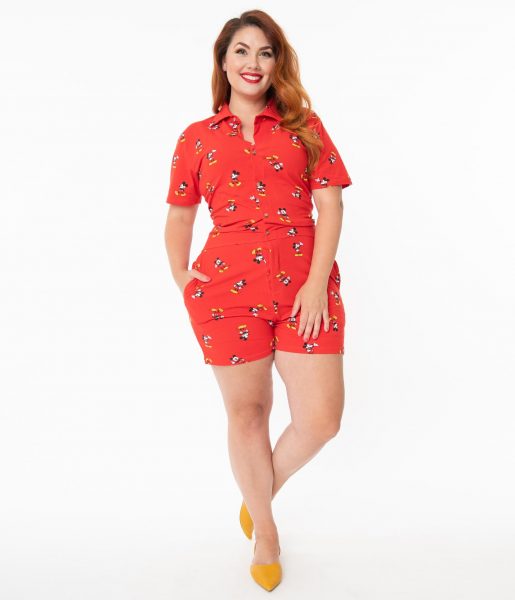 Rep the ultimate classic Disney character with the Cakeworthy Plus Size Retro Mickey Print Romper! Featuring a button-up front and classic collar, this cotton stretch romper is covered with Mickey Mouse print. You can snag one for $48!
