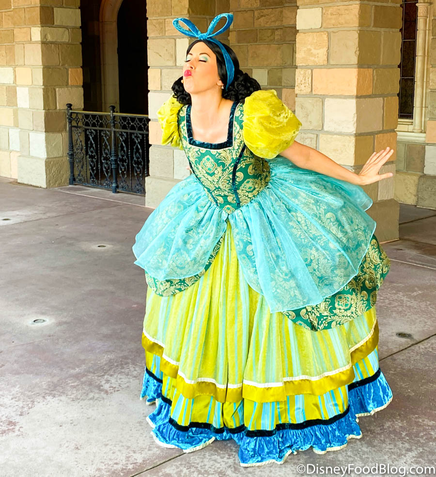 Did you know that sometimes characters will even ride attractions inspired by their films?? It’s not super common to see it, but sometimes Alice or the Mad Hatter will hop on the Mad Tea Party, Cinderella or her stepsisters will wave to guests on Prince Charming Regal Carousel, and Aladdin or Jasmine will fly on the Magic Carpets.