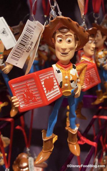 We also spotted ornaments featuring some of our favorite Toy Story characters! The Woody Ornament has the sheriff holding a block with the Disney World park icons! You can lasso one of these for $22.99.